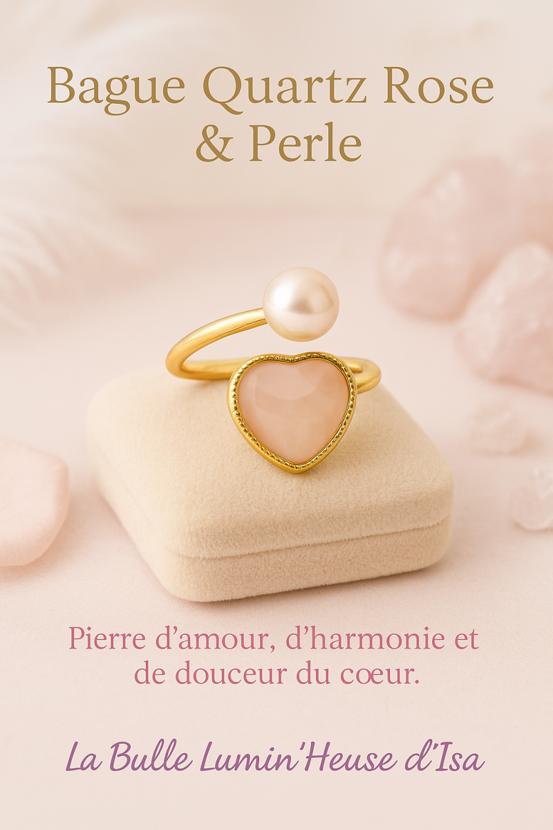 Cette élégante bague ajustable allie la douceur du quartz rose à l’éclat intemporel d’une perle blanche naturelle, formant un bijou empreint d’amour et de féminité.