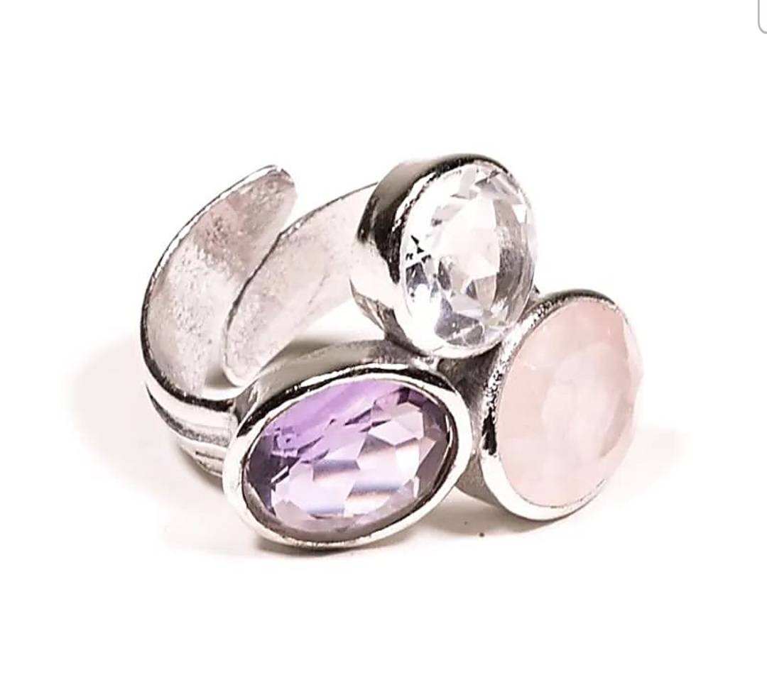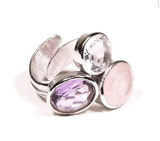 Bague en argent plaqué laiton avec améthyste, cristal de roche et quartz rose, avec couche de finition en rhodium (platine).*Taille ajustable