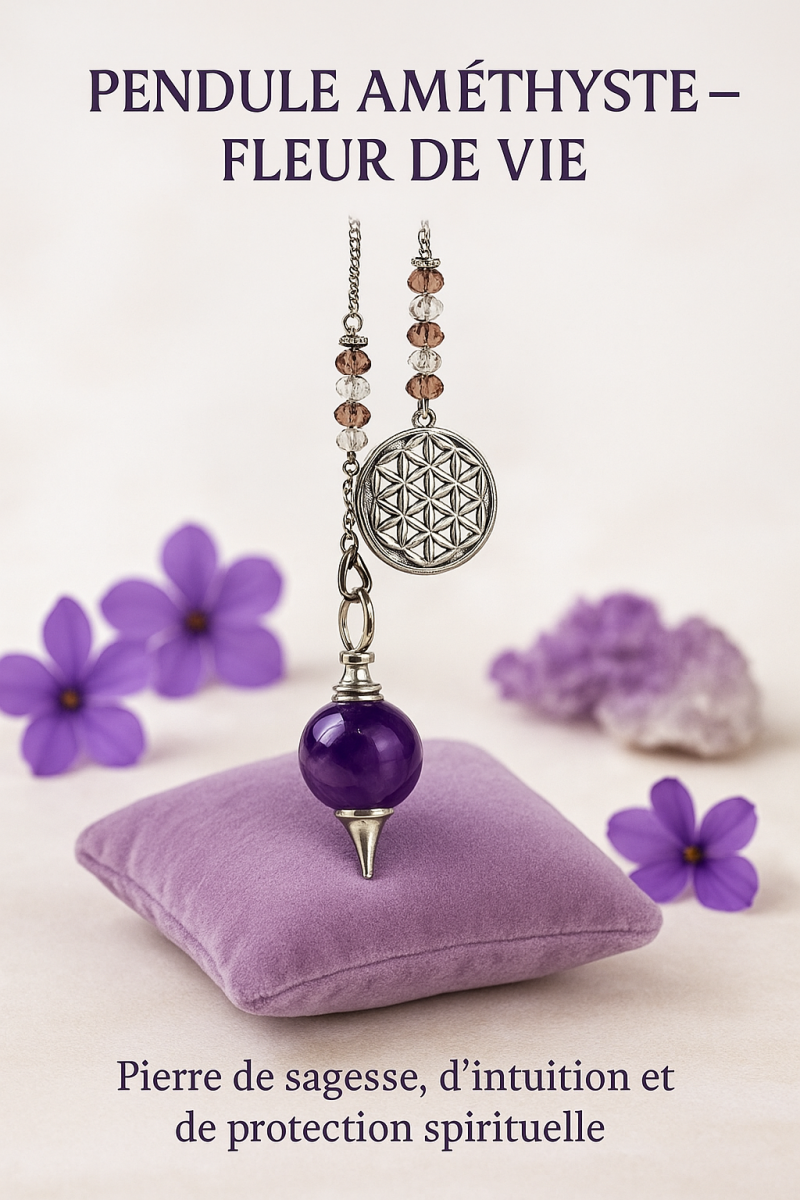 Laissez-vous guider par les énergies subtiles de ce pendule en améthyste, sublimé par une chaîne ornée du symbole sacré de la Fleur de Vie. Cet outil spirituel d’exception associe la puissance vibratoire de l’améthyste à la géométrie sacrée pour une connexion profonde avec votre intuition et le monde invisible.